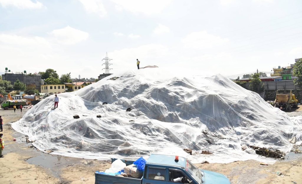 २६ असार, काठमाडौं । काठमाडौं महानगरपालिकाले टेकुस्थित ट्रान्सफर स्टेशनमा थुप्रिएको फोहोरमा जीवातु(जैविक तरल पदार्थ) हालेर प्लाष्टिकले छोपेको छ ।
