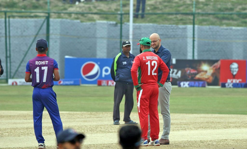 समूह ‘ए’ मा रहेका दुई उपाधि दाबेदार नेपाल र ओमानबीचको खेल कीर्तिपुरस्थित त्रिवि अन्तर्राष्ट्रिय क्रिकेट मैदानमा केहीबेरमा सुरु हुँदैछ ।