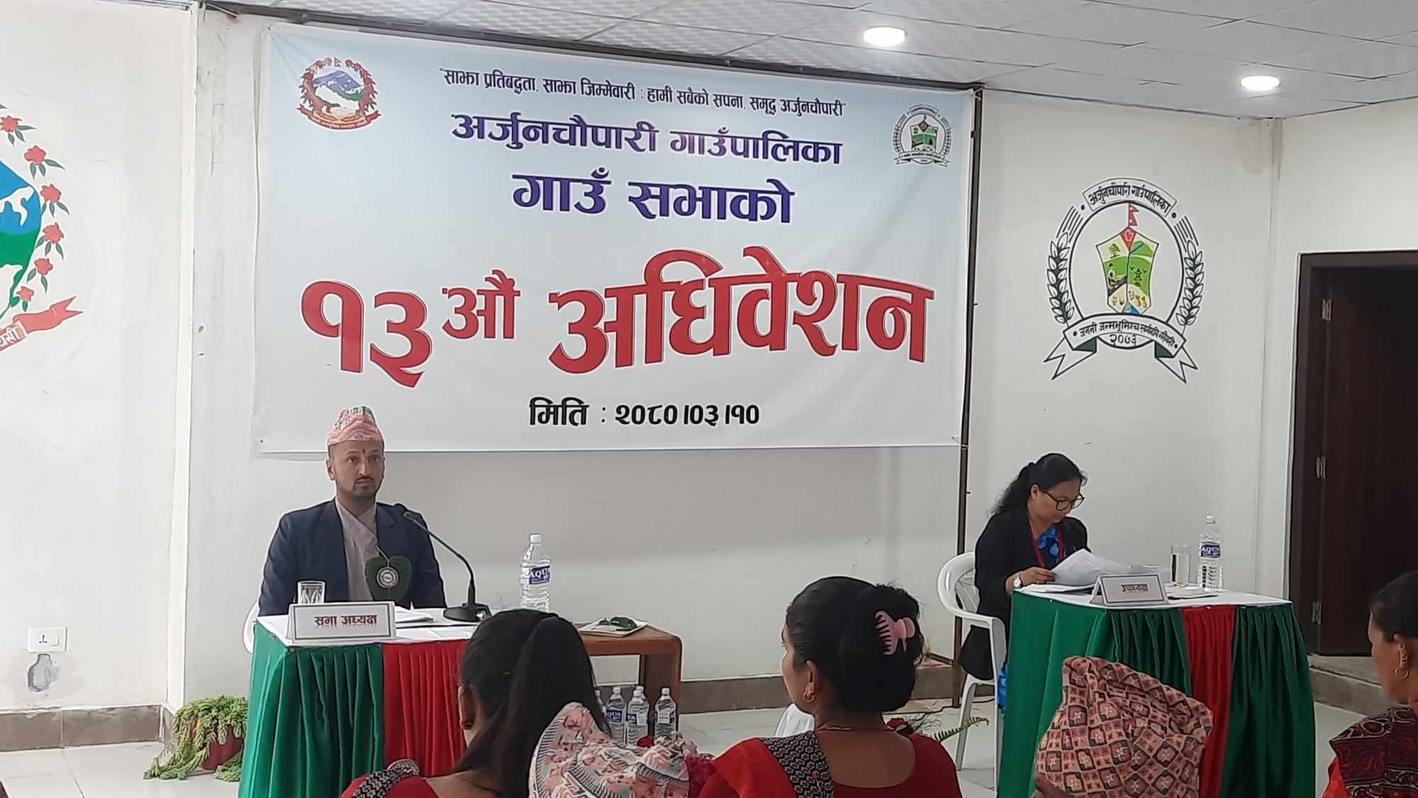 एन सन्चारः अर्जुनचाैपारी, १० असार  :  स्याङ्जा जिल्लाको अर्जुनचौपारी गाउँपालिकाले तेह्रौं गाउँसभाबाट आ.ब. २०८०/८१ का लागि कुल ४४ करोड ६९ लाख २ सयको कुल बजेट र त्यसको स्रोत व्यवस्थापनको रकमसहितकाे नीति तथा कार्यक्रम पारित गरेको छ । यसमा चालु २६ करोड ७६ लाख दुई सय र पूँजीगत १७ करोड ९३ लाख विनियोजित गरिएको छ ।